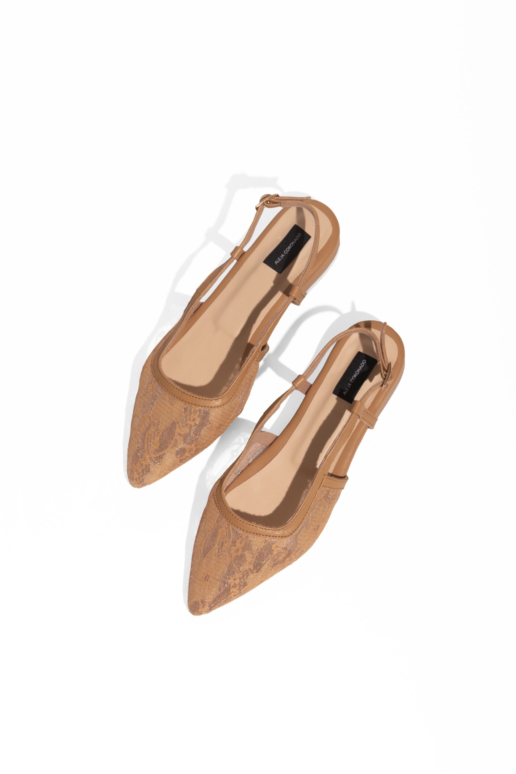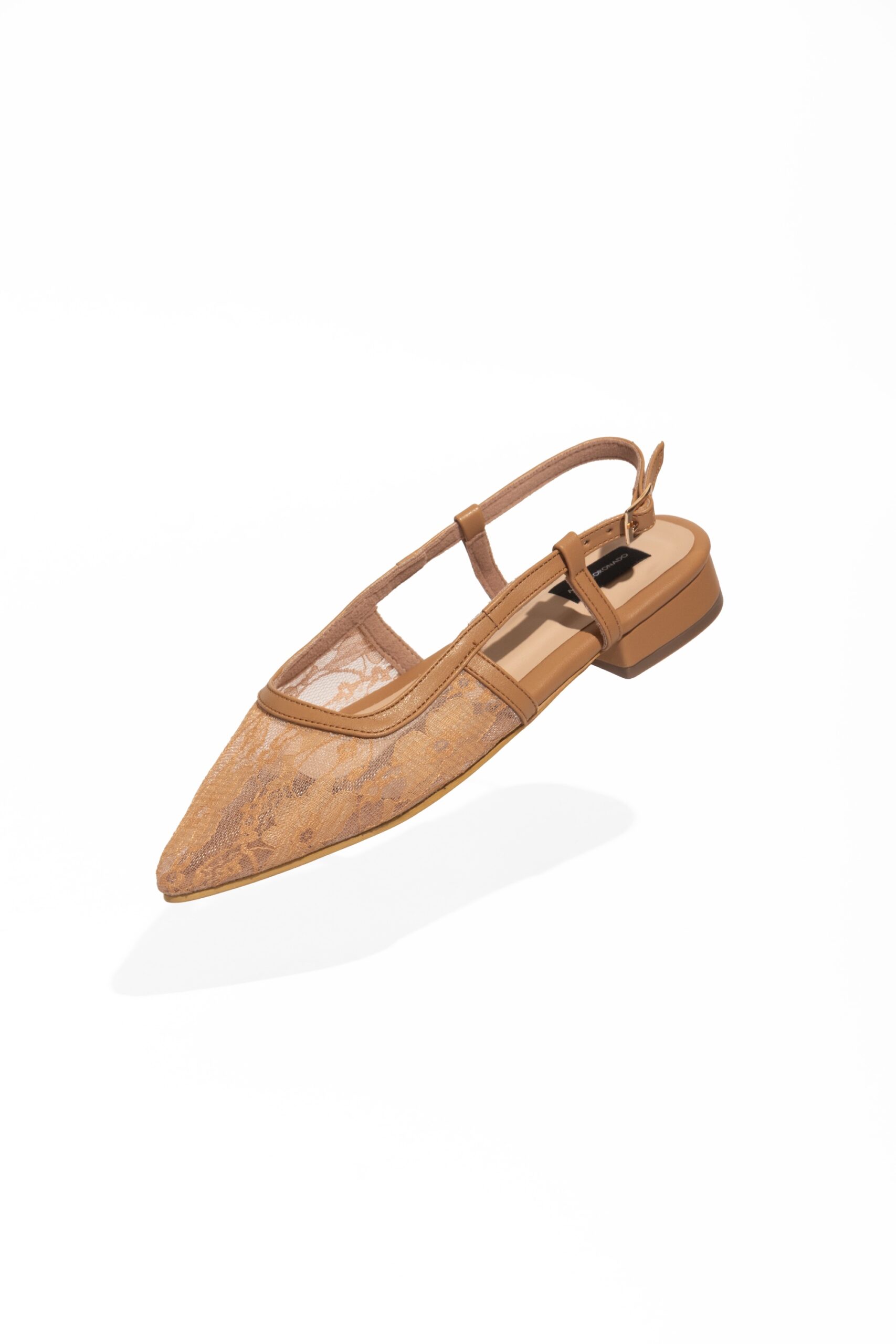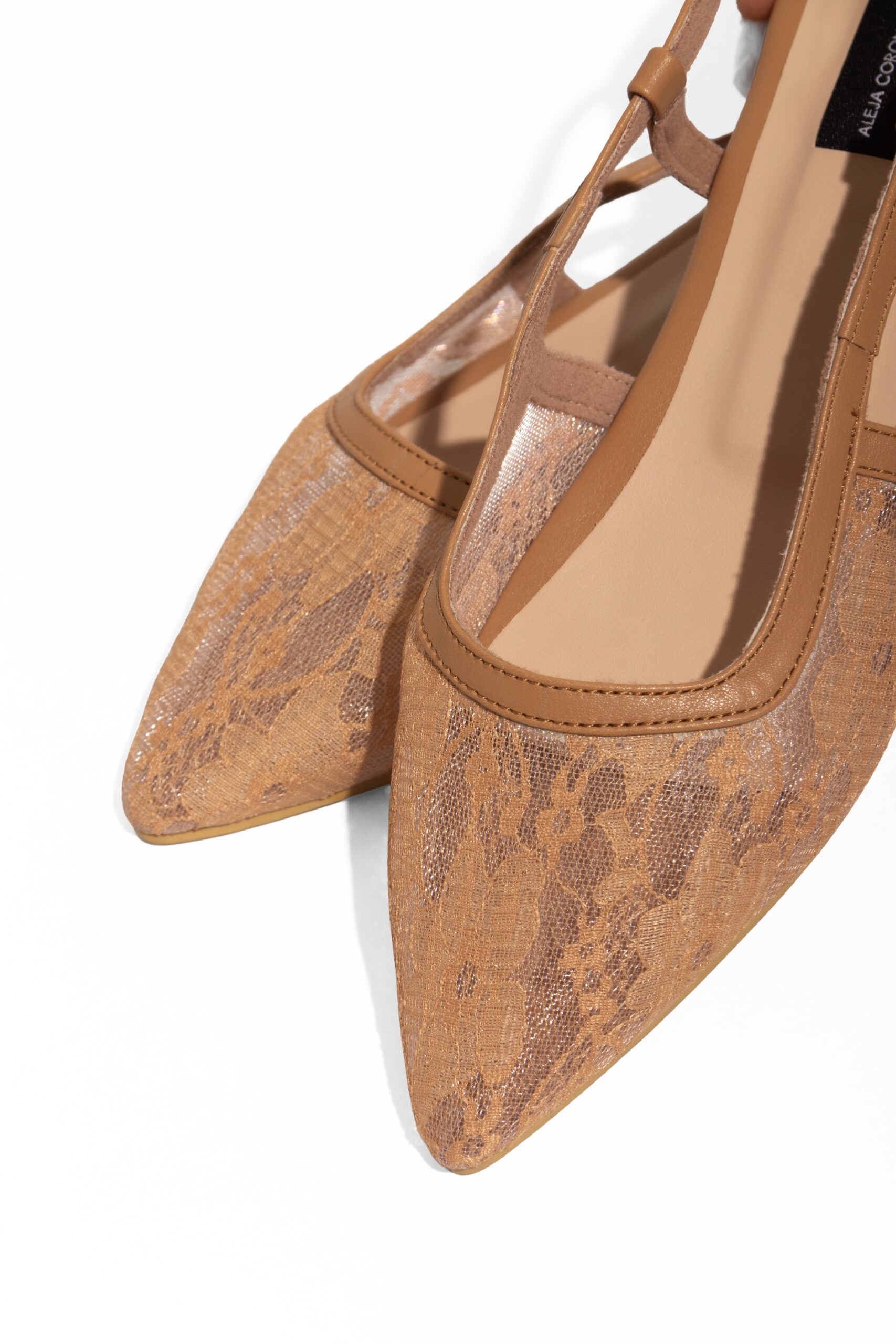 Zapatos destalonados estilo puntudos en encaje tono camel, altura de tacón: 1.5 cm. Perfectos para ser combinados con todos tus looks desde los más formales a los casuales. Capellada: encaje material textil combinado con cuero vegano pu Suela: neolite material sintético con resistencia al desgaste. Herrajes: material inoxidable zamak.
